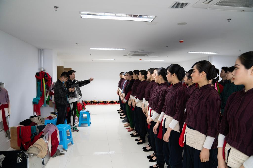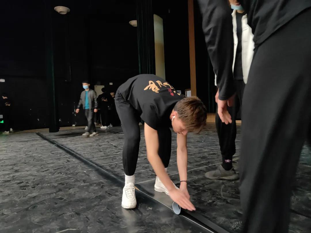 到达演出场地后,同学们就开始忙绿起来,男生铺地胶、女生贴地标,大家都在为“乳娘”尽自己的一份力。乳娘的精神是刻在骨子里的,不仅仅体现在舞台上,在平时的生活和学习中乳娘的无私、大爱的精神值得每一个人学习。