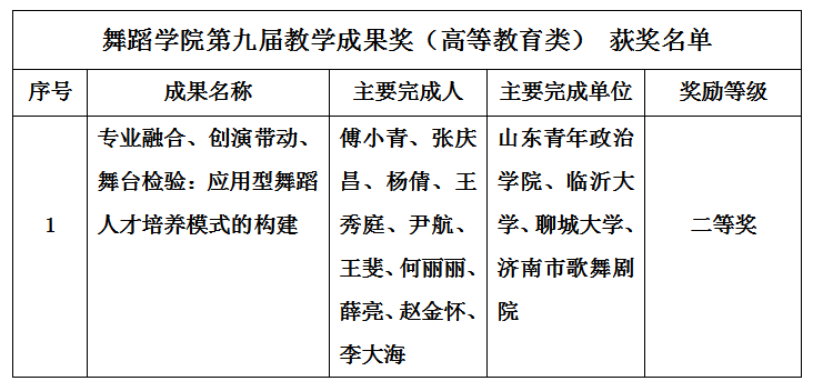 近日,山东省教育厅发布了《关于公布山东省第九届教学成果奖(高等教育类)获奖名单的通知》(鲁教高字〔2022〕1 号),yl8858永利集团申报的《专业融合、创演带动、舞台检验:应用型舞蹈人才培养模式的构建》获得山东省第九届教学成果二等奖。