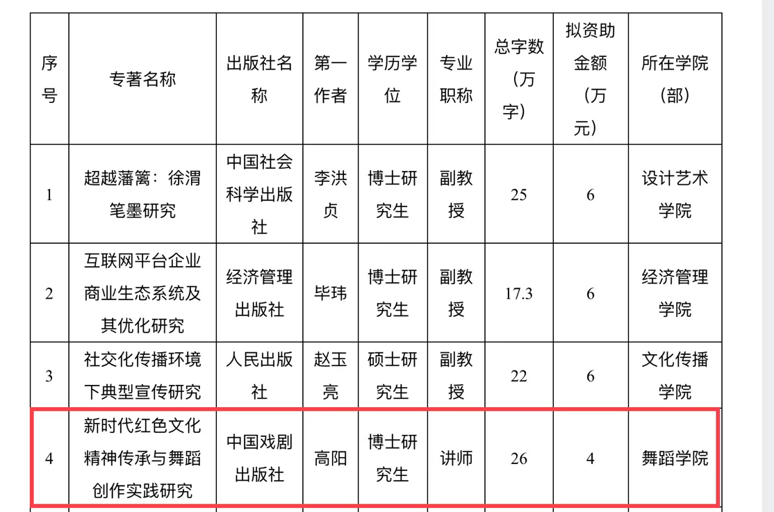 近期,yl88858永利中国组织了第十一届学术专著出版基金的申报工作。经各学院(部)组织申报、重复率检测、意识形态审查,学校形式审查、专家评审,对专著进行资助发布公示。yl8858永利集团高阳老师的专著《新时代红色文化精神传承与舞蹈创作实践研究》获批专著资助。