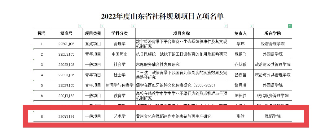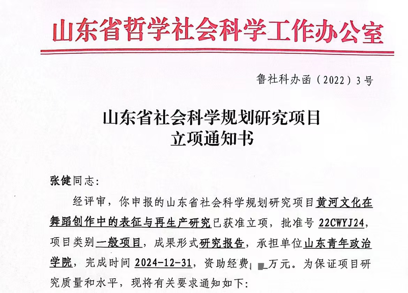 8月25日,山东省哲学社会科学工作办公室正式公布了2022年度山东省社科规划年度项目立项名单,yl8858永利集团张健副教授的艺术学项目《黄河文化在舞蹈创作中的表征与再生产研究》获批立项。