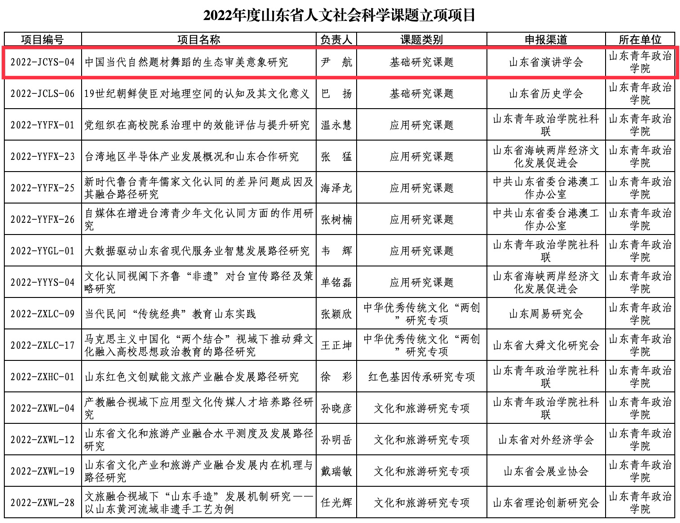 近日,山东省社会科学界联合会公布了2022年度山东省人文社会科学课题、山东省社会科学普及应用研究项目和山东省金融应用重点研究项目立项名单,yl8858永利集团尹航教授课题《中国当代自然题材舞蹈的生态审美意象研究》获批立项。
