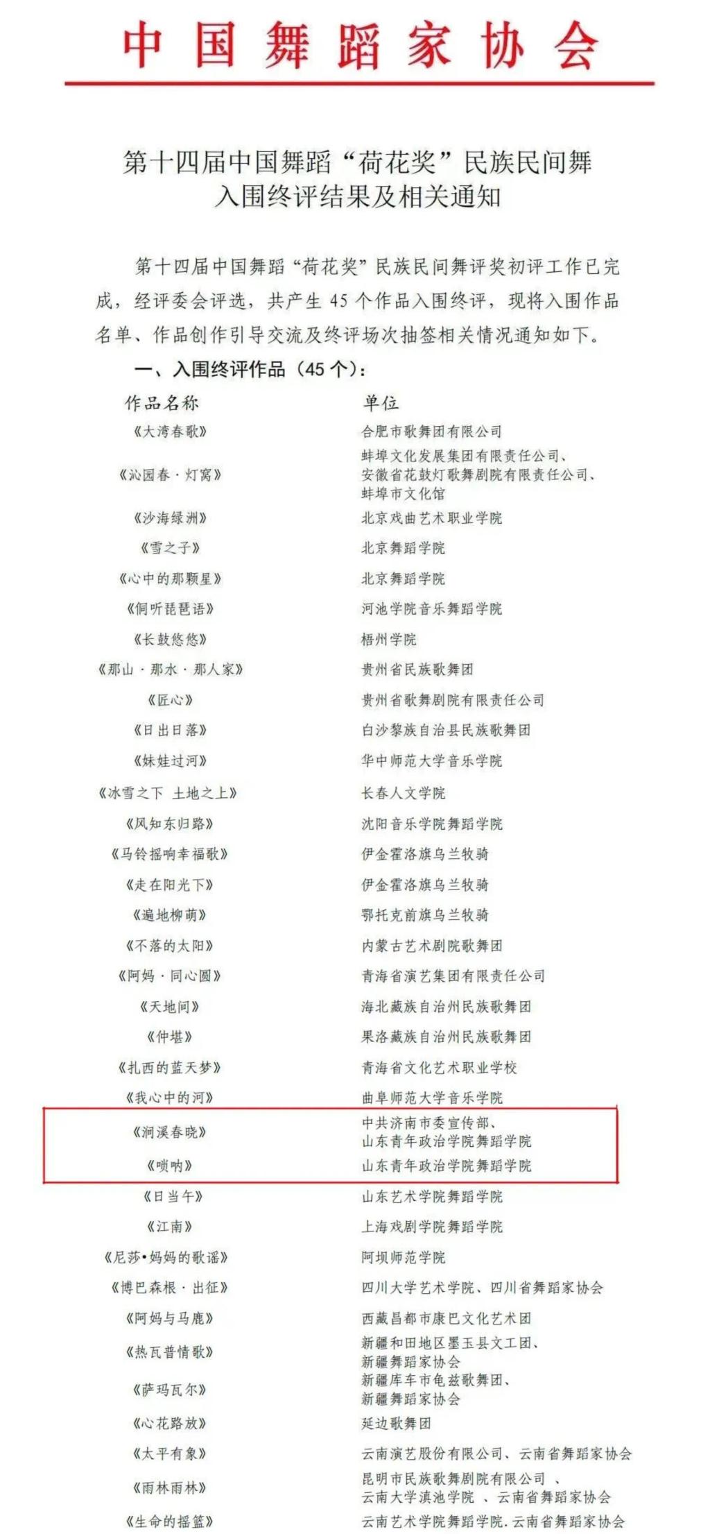 7月19日,中国舞蹈家协会公布了第十四届中国舞蹈“荷花奖”民族民间舞入围终评名单,yl8858永利集团原创作品《涧溪春晓》《唢呐》入选。
