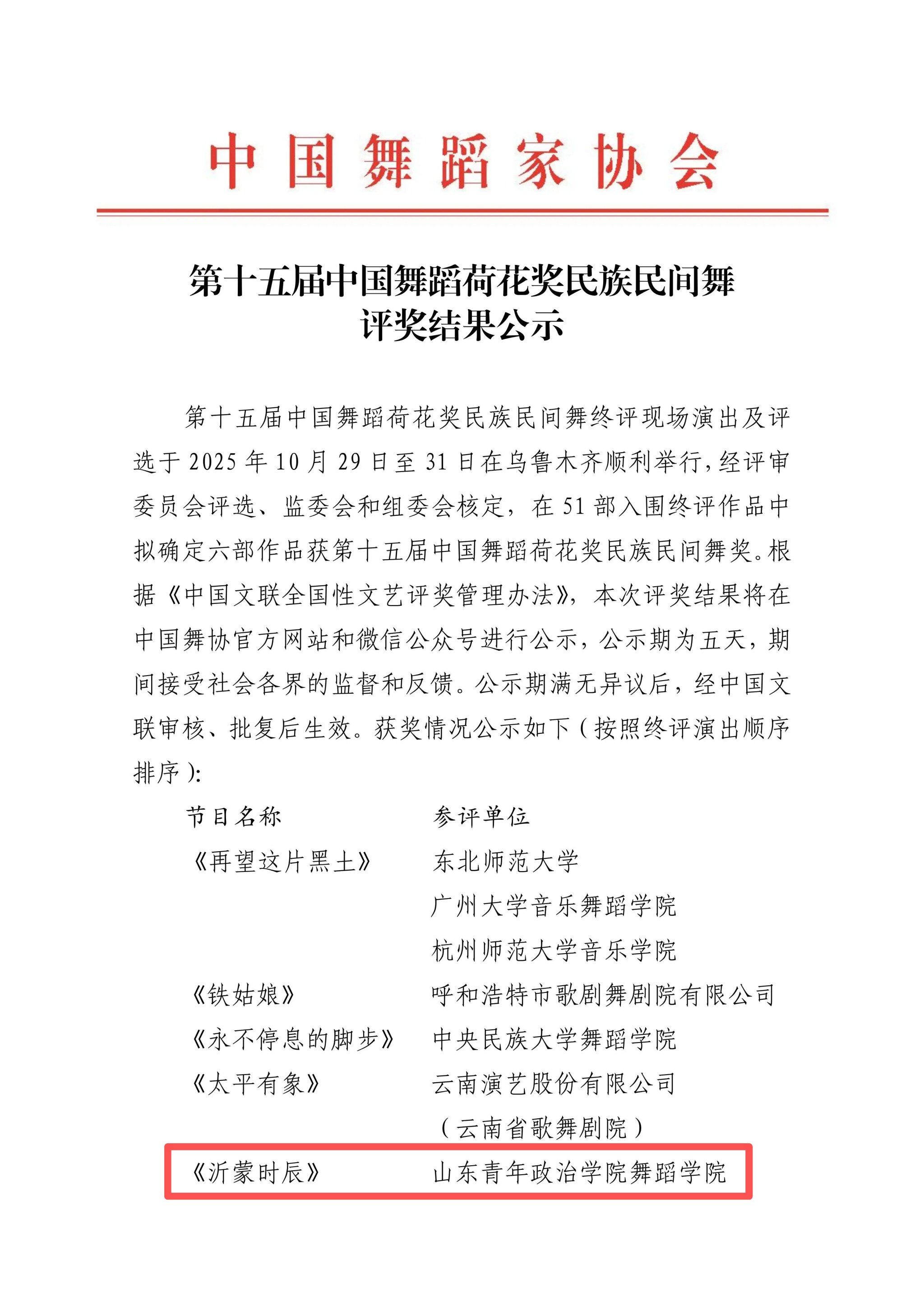 学校原创作品《沂蒙时辰》荣获第十五届中国舞蹈荷花奖民族民间舞奖
