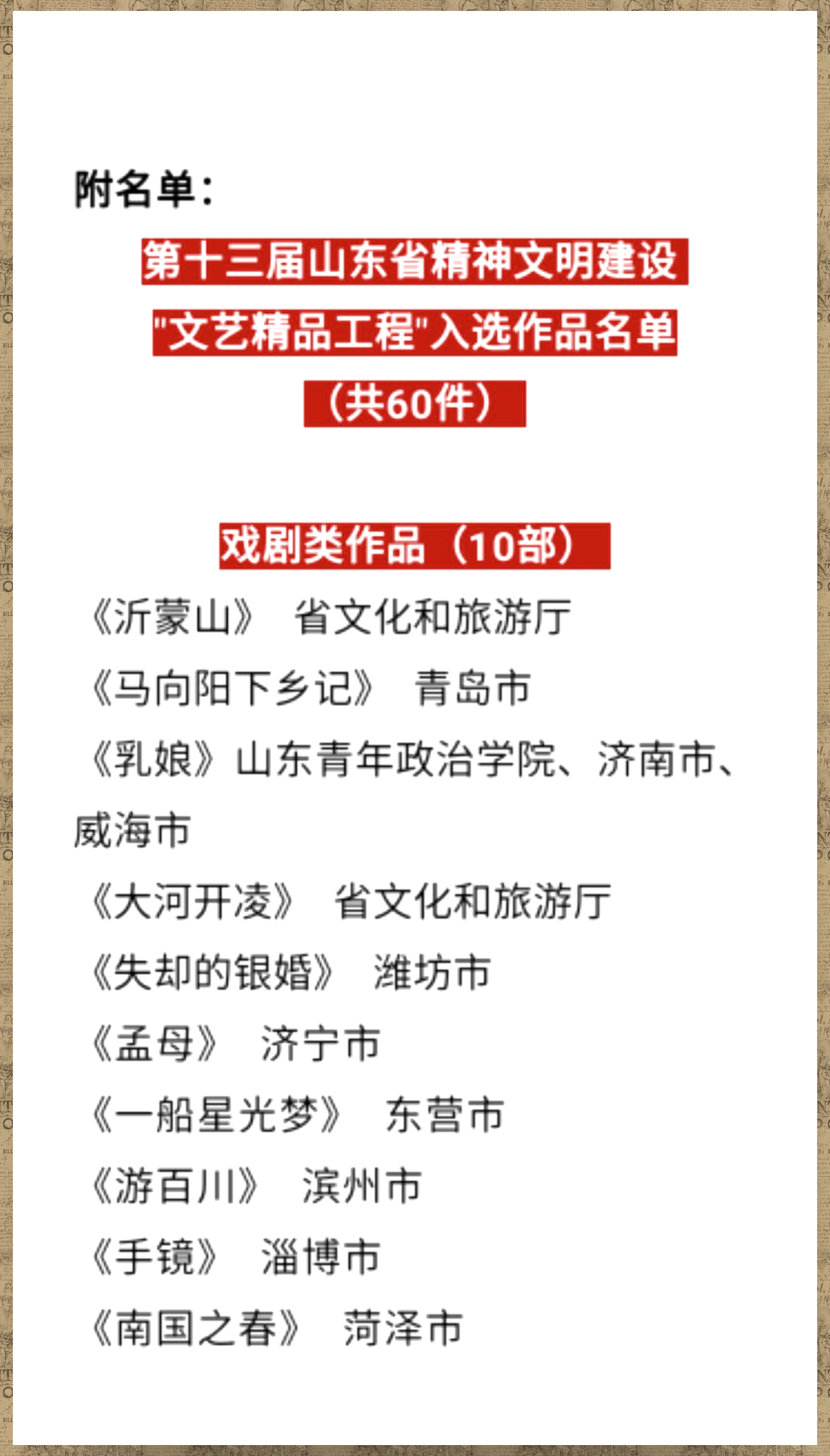 近日,根据中共山东省委宣传部精神文明建设“文艺精品工程”评审领导小组办公室发布的《关于第十三届山东省精神文明建设“文艺精品工程”入选作品公示的公告》,我校原创红色舞剧《乳娘》成功入选。