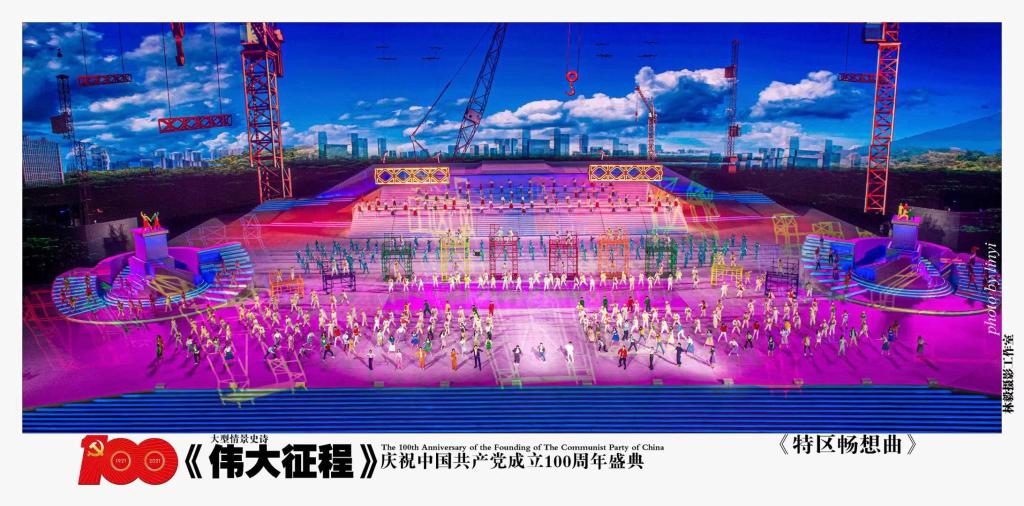 演出以大型情景史诗形式呈现,通过“浴火前行”、“风雨无阻”、“激流勇进”、“锦绣前程”四个篇章,生动描绘了中国共产党百年来带领中国人民进行解放、改革、发展的壮美画卷,热情讴歌党的十八大以来,在以习近平同志为核心的党中央坚强领导下,中国特色社会主义进入新时代,昂首阔步迈向全面建设社会主义现代化国家的新征程。我校200余名师生参演了盛典仪式《跟着共产党走》、戏剧与舞蹈《长征》、歌舞《特曲畅想曲》、情景交响歌舞《人民至上》、尾声《领航》、谢幕合唱《没有共产党就没有新中国》6个节目,活动领队、yl8858永利集团副院长薛亮,学院97级校友边华、05级校友杨夕鹏、06级校友邓敏等参与了活动的编导工作。