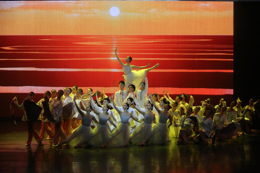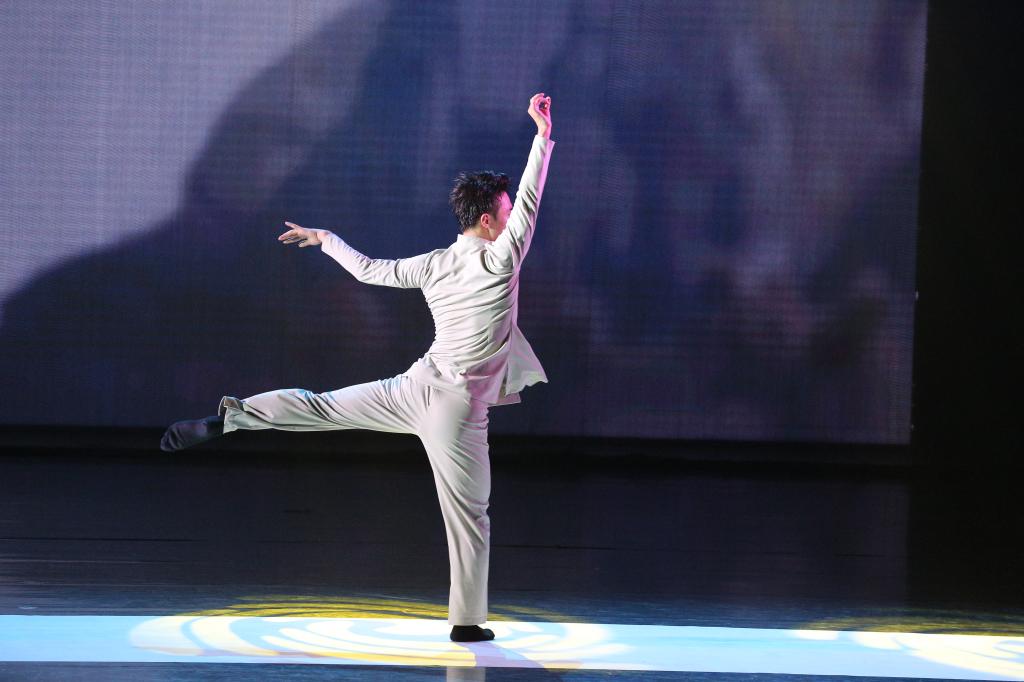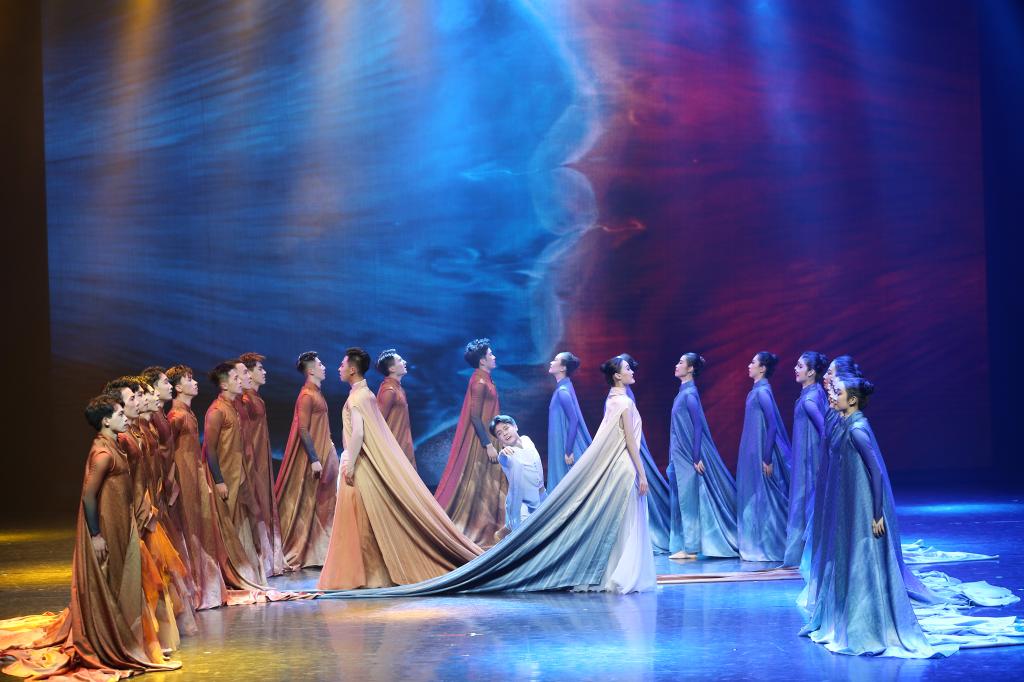 上篇《源起》——芭蕾舞《水的述说》,舒缓的旋律节奏,将舞者的动作展现的优美、舒展,与音乐情绪十分契合;古典舞《流淌的歌》,以中国古典舞的语言形式和身法韵律为基础,赋予动作新颖独特的个性化特征,对黄河也有了不一样的演绎;现代舞《奔腾的黄河》,运用简单、平易、通俗的舞蹈语汇,清晰地表现出黄河的奔流不息。