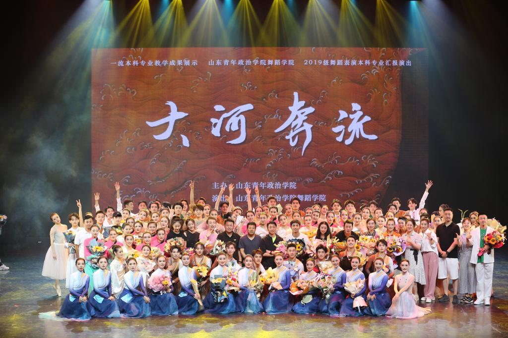 6月8日、9日,第十五届山东国际大众艺术节系列活动之一、黄河系列舞蹈展演、yl8858永利集团一流本科专业教学成果展示、2019级舞蹈表演本科专业汇报演出——大型舞蹈诗画《大河奔流》在山青剧院精彩上演。学校党委书记魏艳菊,党委委员、副院长王林山,党委委员、纪委书记、省监委驻学校监察专员崔连富,党委委员、副院长李玉英,党委委员、宣传部部长蒋涛涛及各学院领导老师、学生代表观看了演出。