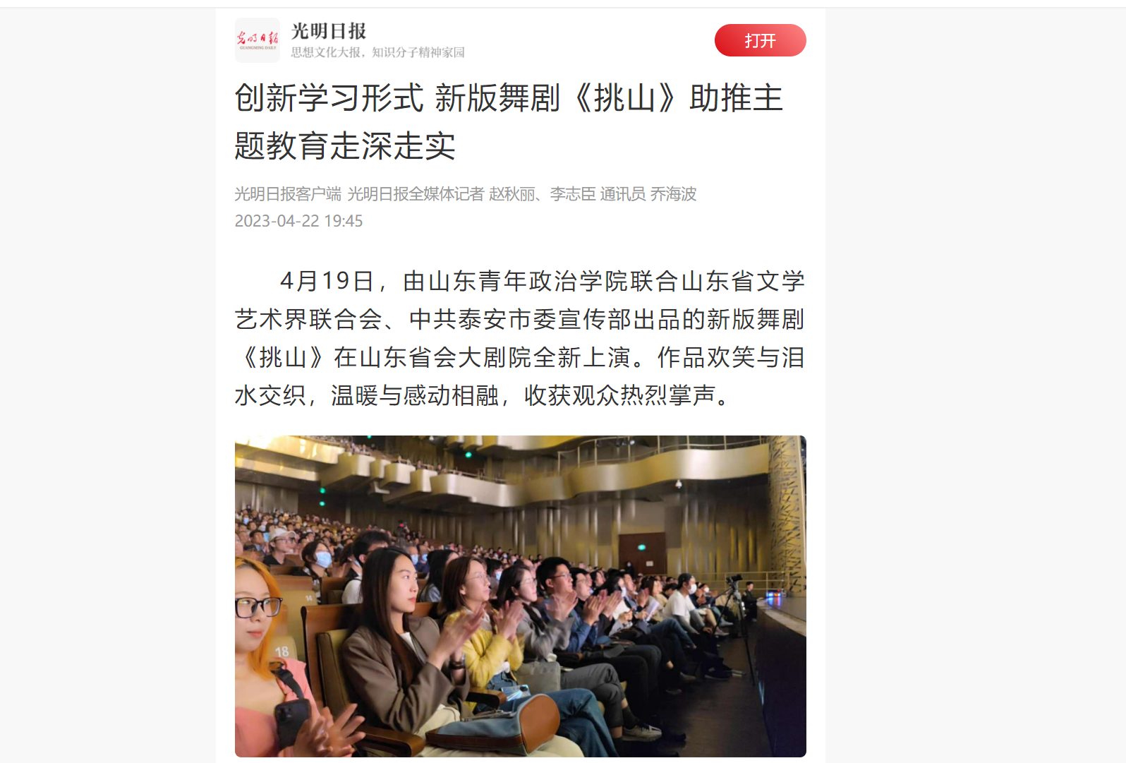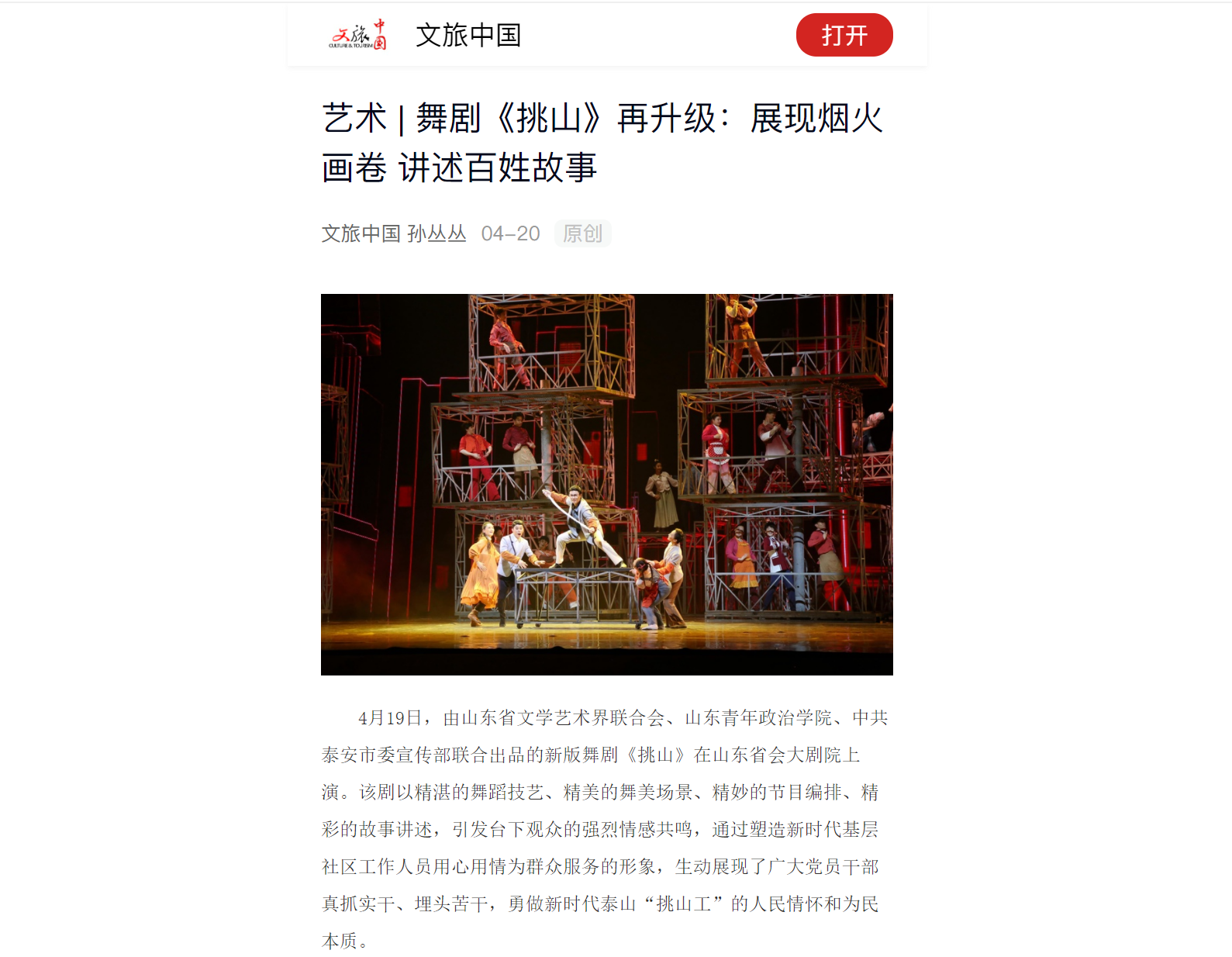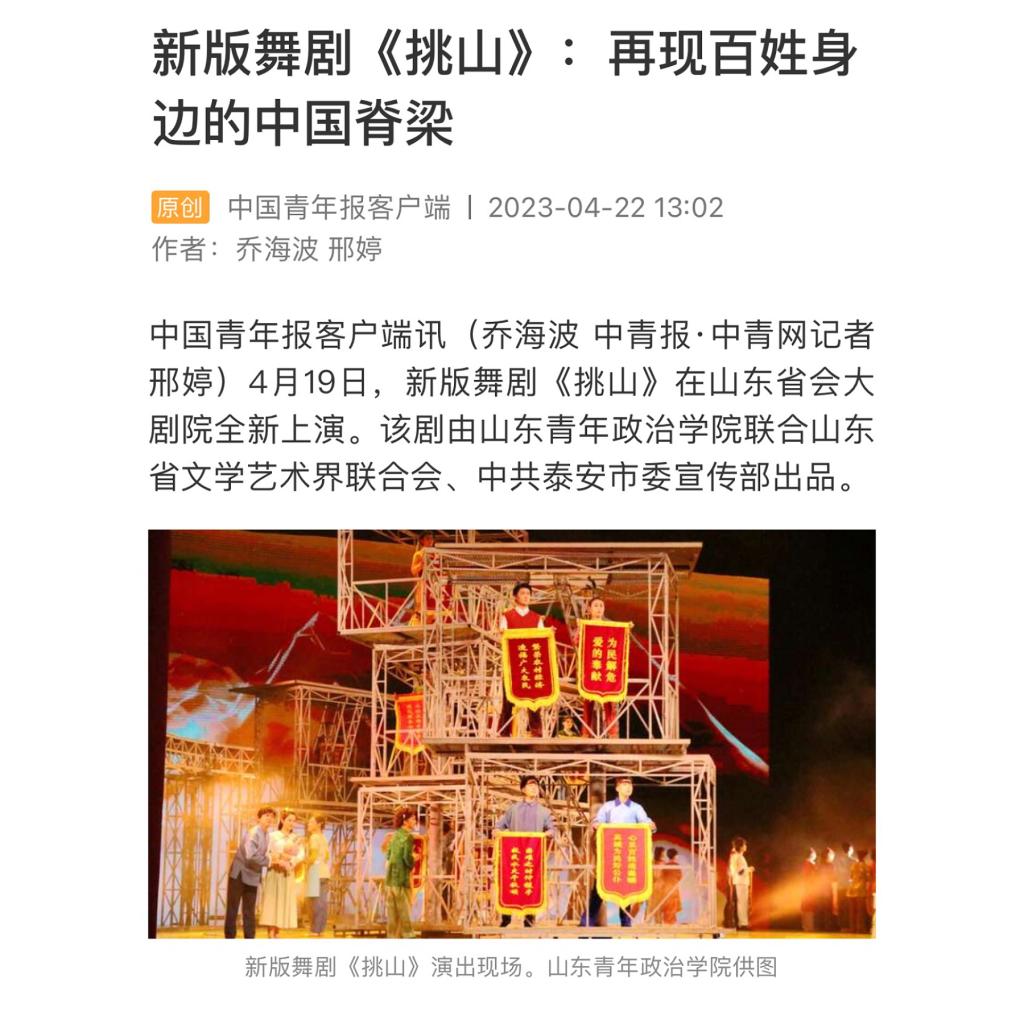 4月19日、20日,由我校联合山东省文学艺术界联合会、中共泰安市委宣传部出品的新版舞剧《挑山》在山东省会大剧院上演,人民日报、央视新闻、新华网、光明日报、中国青年报、中国山东网、山东教育新闻网、山东新闻联播等39家主流媒体第一时间报道演出盛况,引发了强烈的社会反响,《挑山》热度持续走高,好评如潮,备受赞誉。