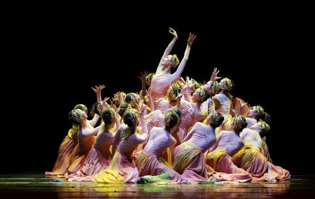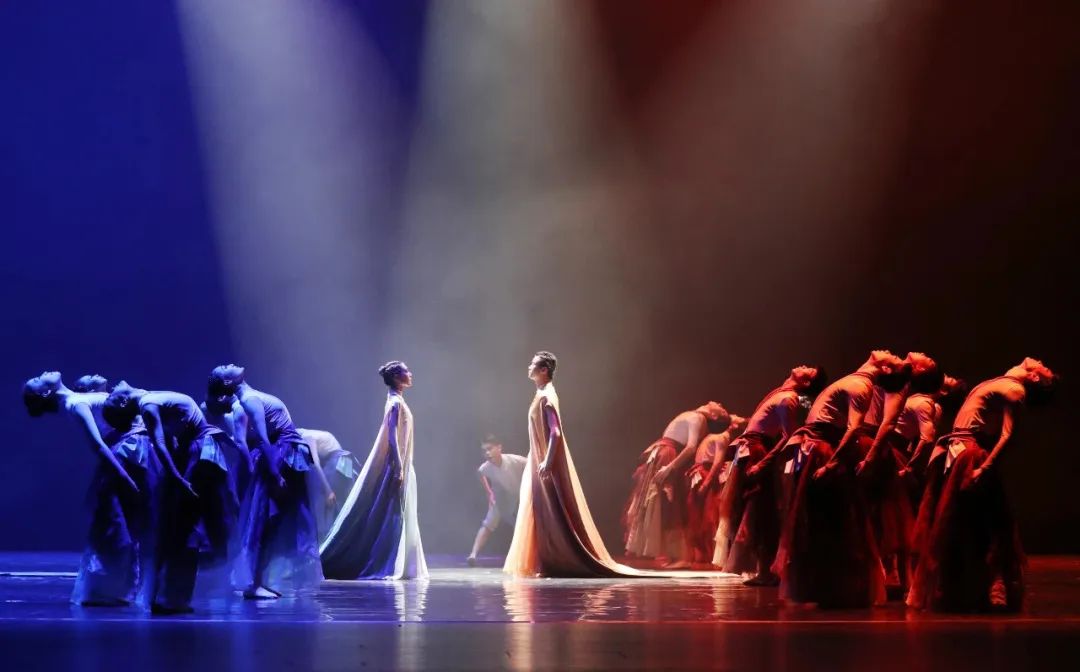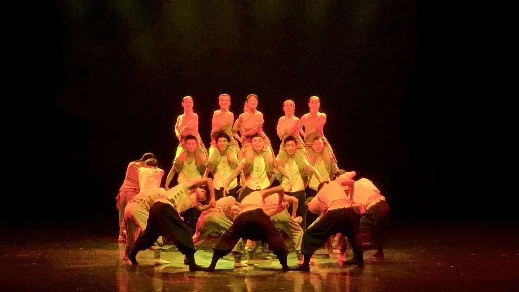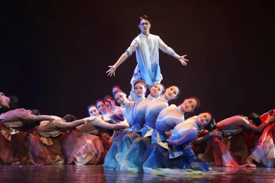 黄蓝交汇,万鸟翔集,泥沙与大海的气息汇聚融合,好似一条蜿蜒的长龙在河与海之中遨游!在构建人类命运共同体的时代浪潮中,新时代的华夏儿女以朝气蓬勃的青春力量奔赴山河,以奋发向上的热血情怀拥抱世界。群舞《入海》从当代视角切入,通过交响编舞法意象性地描绘出黄河入海过程中淤积延伸——湍流摆动——静谧回归的自然景观,以精神意识颂扬母亲河的伟岸,同时映射当今国际视野下中国与各国多元共生的繁荣景象。
