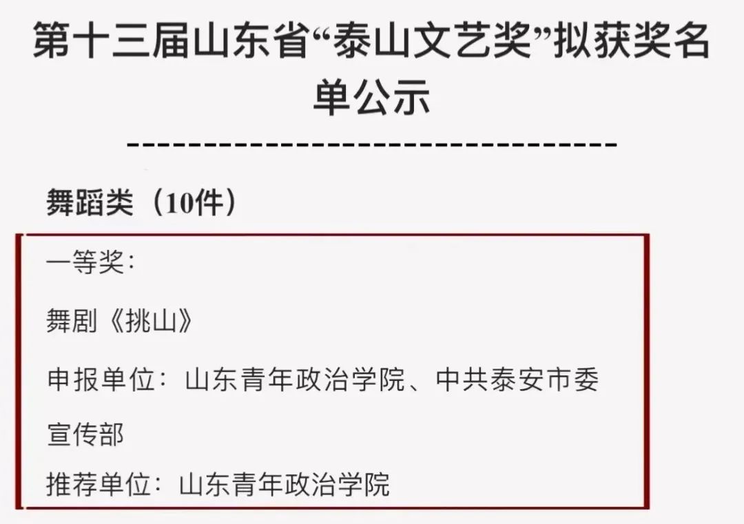 近日,第十三届山东省“泰山文艺奖”评选结果公布,由学校联合山东省文学艺术界联合会、中共泰安市委宣传部出品的新版舞剧《挑山》荣获舞蹈类一等奖。