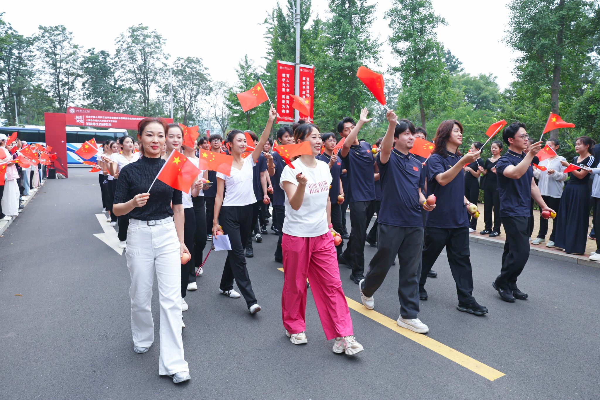 仪式现场,参演师生手擎五星红旗沿映湖西路有序入场,道路两侧的在校学生以“国之大典,有我山青!”的铿锵呐喊与持续热烈的掌声,向载誉归来的师生致以崇高敬意,鲜红旗帜与灿烂笑脸相映,定格成校园内饱含荣光的动人图景。