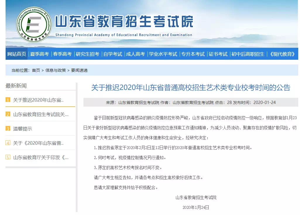根据上级部门关于新型冠状病毒感染的肺炎疫情防控工作要求,为切实做好当前疫情防控工作,保障广大考生是身体健康和生命安全,根据《教育部关于切实做好新型冠状病毒感染的肺炎疫情防控工作应急预案的通知》(教电〔2020〕35 号)、《山东省招生考试委员会办公室关于做好我省2020年普通高校艺术类专业招生校考工作的紧急通知》(鲁招考委办〔2020〕5号)、《山东省教育厅关于切实做好新型冠状病毒感染的肺炎疫情防控工作应急预案的通知》(鲁教办字〔2020〕2号)精神,经学校研究决定,推迟我校原定于2月3日—7日进行的播音主持类、舞蹈类专业联考。具体考试时间另行通知,请及时关注我校招生网(http://zsb.sdyu.edu.cn/)和招生办公室官方微信公众号(山青招生与培养:Sdyuzs)公布的相关最新信息 ,及时掌握考试安排。