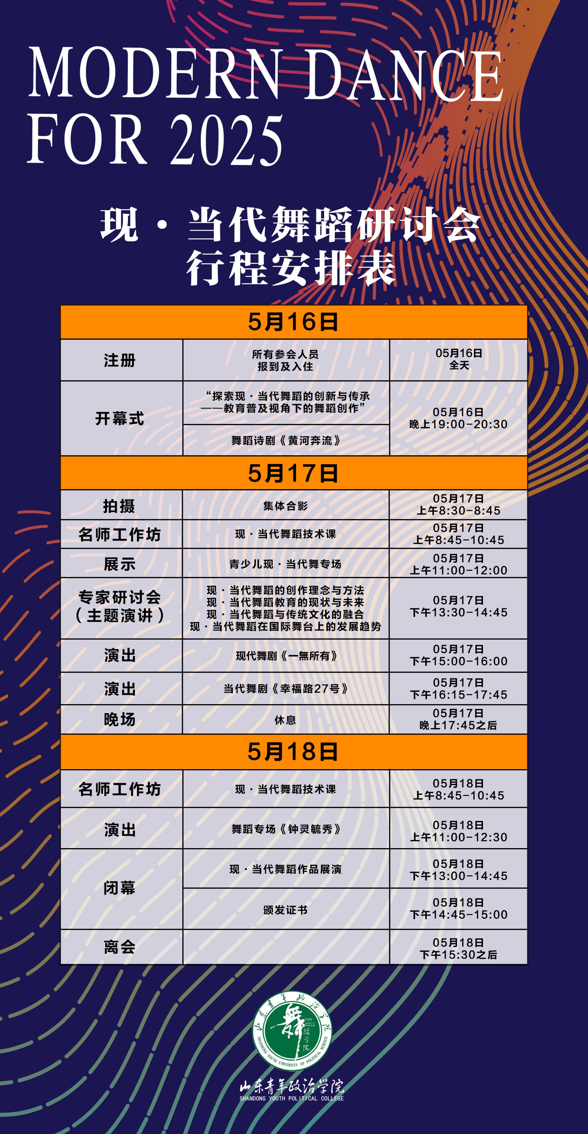 为探索现当代舞蹈的创新与传承,探讨教育及视角下的舞蹈创作,由yl88858永利中国主办的"2025年现当代舞蹈研讨会"拟于2025年5月16日至18日在济南举行。旨在为舞蹈创作者、教育者、学者和爱好者提供一个交流平台,分享现当代舞蹈创作的经验和理念,促进现当代舞蹈的创新与传承,提升现当代舞蹈的艺术水平和社会影响力。诚邀各位同行、舞蹈爱好者们光临,共同为推动现当代舞蹈的创新与传承贡献智慧和力量!