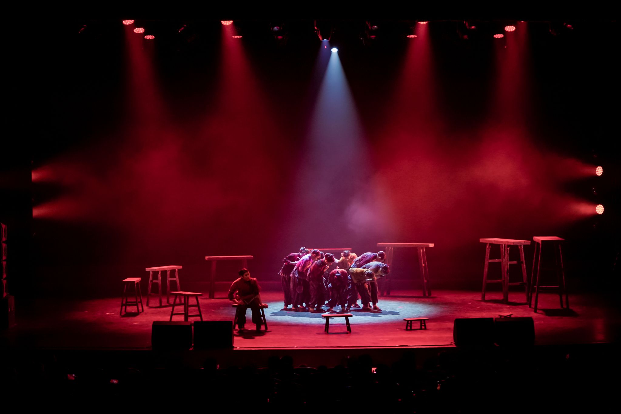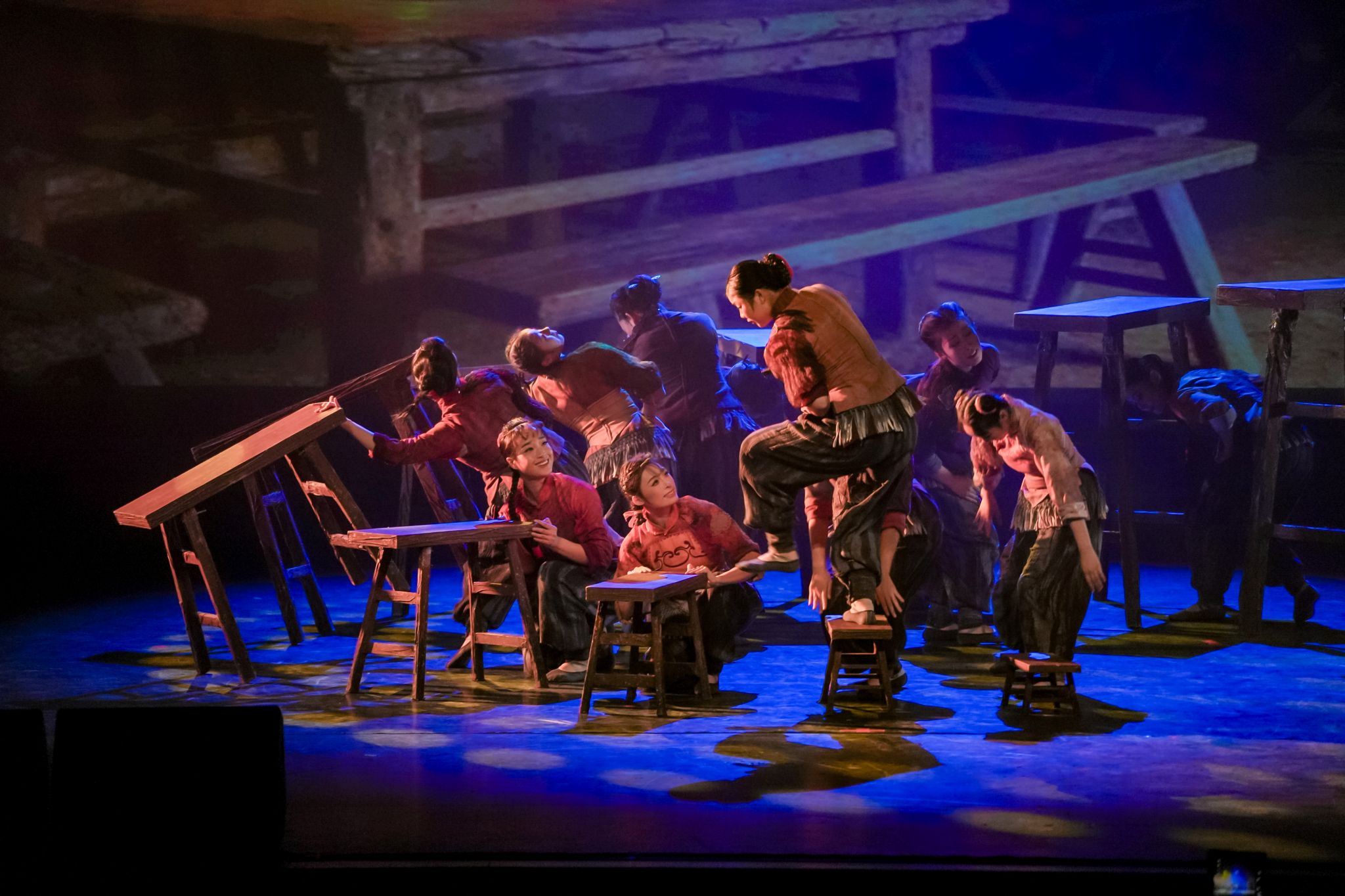 《沂蒙时辰》自2022年启动创作,期间主创团队多次赴临沂革命老区采风,九易其稿精心打磨。作品以“鸡叫门儿”“雾露明门儿”等充满生活气息的沂蒙方言时辰为脉络,串联红嫂日夜操劳、无私奉献的感人场景;同时,作品深度汲取山东秧歌动律精髓,以“圆”为核心视觉意象,象征时间循环与精神永续,演员借板凳道具,生动演绎出红嫂的坚韧、勤劳与乐观。