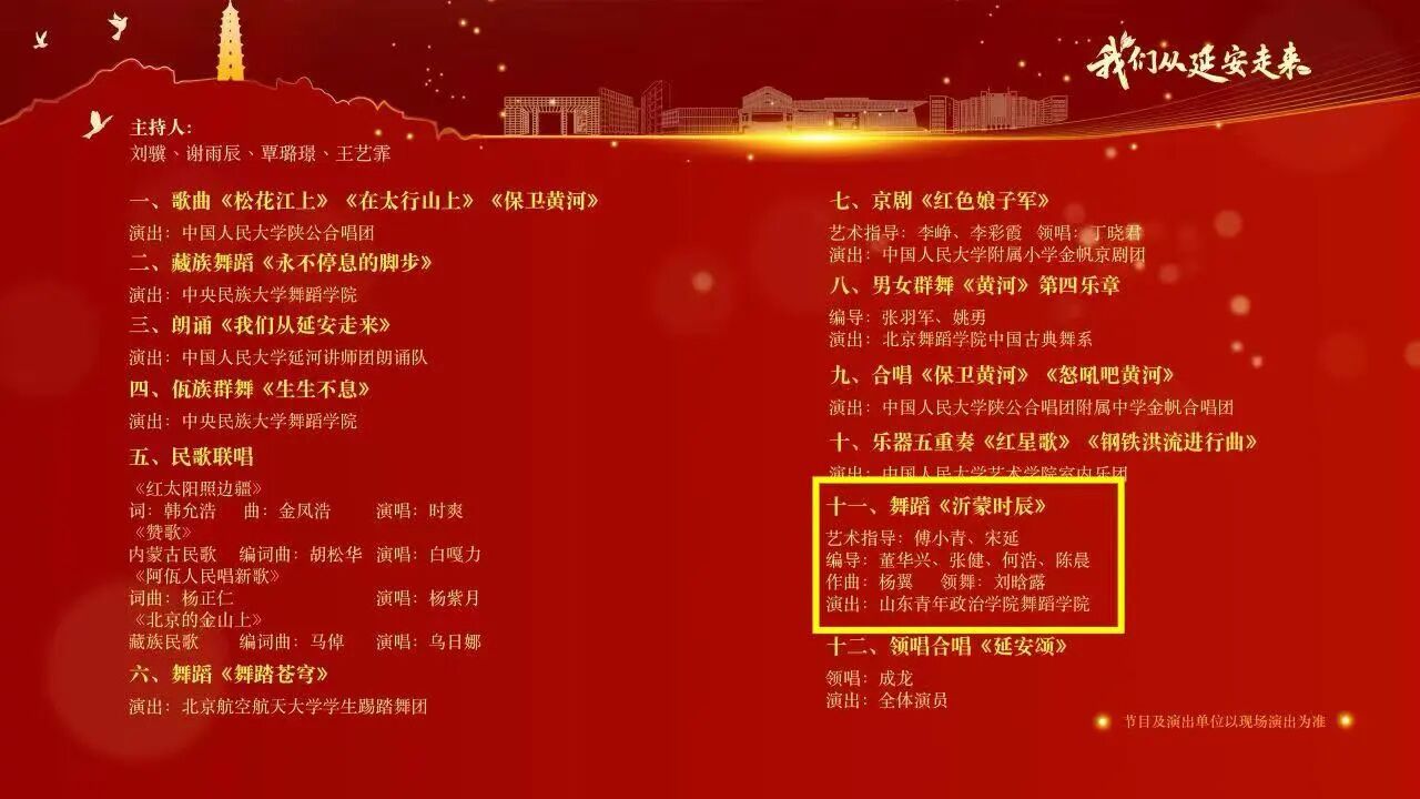 12月23日,由中国人民大学与中国延安精神研究会联合主办的“我们从延安走来”主题演出在明德堂隆重上演。其中yl8858永利集团创作的《沂蒙时辰》作为京外唯一受邀高校节目参演,凭深厚地域底蕴与真挚情感表达,赢得现场观众深切共鸣与高度评价。