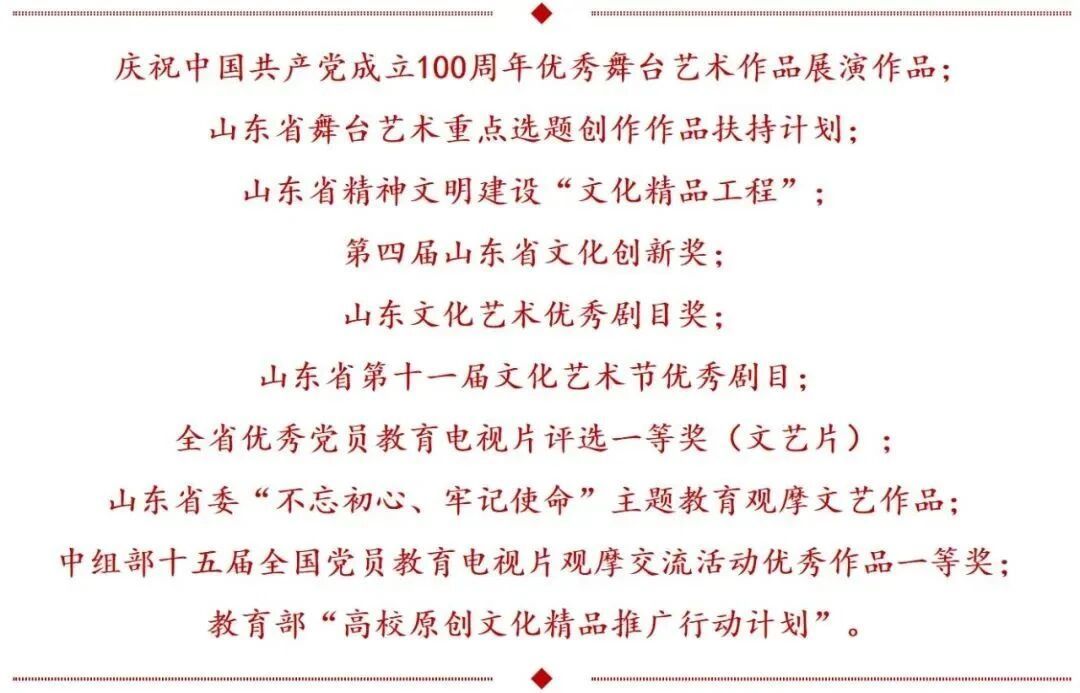 舞剧《乳娘》入选庆祝中国共产党成立100周年优秀舞台艺术作品展演作品,教育部、文化和旅游部、财政部联合主办的“高雅艺术进校园”活动参演剧目,获评“山东省舞台艺术重点选题创作作品扶持计划”、山东省第十三届文化精品工程、第四届山东省文化创新奖、山东文化艺术优秀剧目奖、教育部高校原创文化精品推广行动计划,获全省优秀党员教育电视片评选一等奖(文艺片),被省委组织部列为“不忘初心、牢记使命”主题教育观摩文艺作品,获中组部第十五届全国党员教育电视片观摩交流活动优秀作品一等奖。